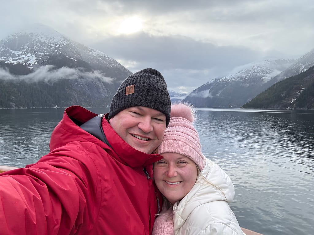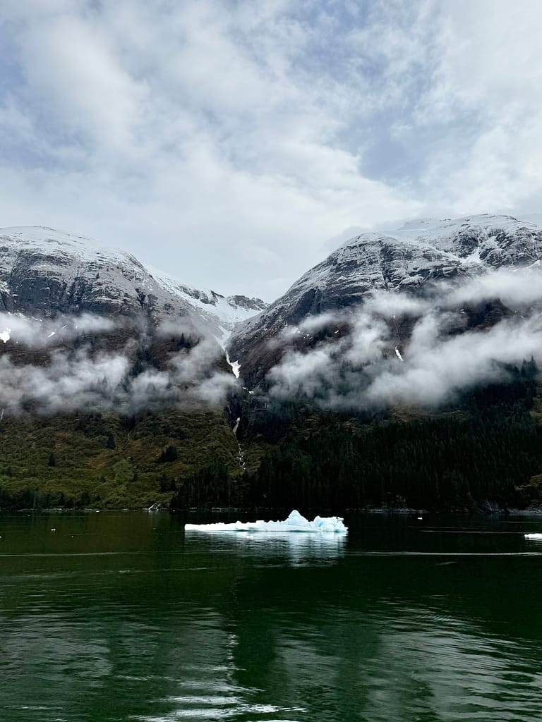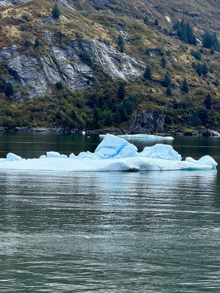 Sailing through Tracy Arm Fjord felt like stepping into a dream. Towering waterfalls tumbled down cliffs so high they disappeared into the mist, and the water was dotted with floating chunks of glacial ice—each one its own tiny iceberg drifting silently past. There were hot cocoa stands set up all around the outside decks that morning, and somehow that little detail made everything feel even more magical. It was like they’d thought of everything. We bundled up, wrapped our hands around warm mugs, and stayed outside for hours just watching the ice float by. It looked exactly like the brochures—and somehow, even better.